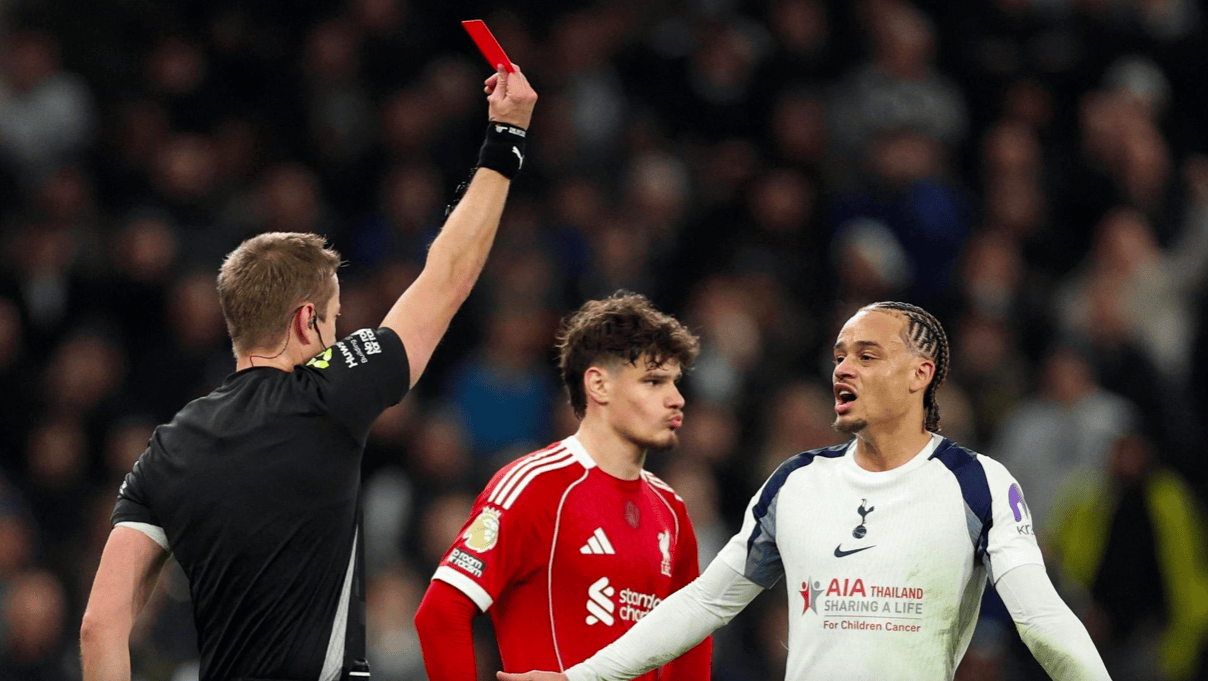 VAR介入,裁判回看过后做出改判,直接向西蒙斯出示红牌,来到英超的第14场比赛,花费热刺6000万欧元的西蒙斯打进1球,送出2次助攻,数据依旧惨淡。